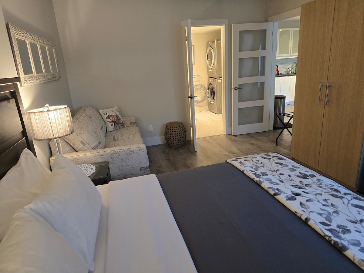 Woodsy Loft, an ideal home base for not just the beach and stunning sunsets, but Blue Mtn, Scandinave Spa, C-wood, brand new casino, all close by. Many bars, restaurants, beach and other things to do, within 5 min. Great place to stay in, too. Packed with amenities like screened in patio, XL bathtub w/ towel warmer, King size bed, 'The Frame' TV, full kitchen, fast WIFI, motorized blind...and the list goes on. Situated and designed to offer max. privacy and relaxation.