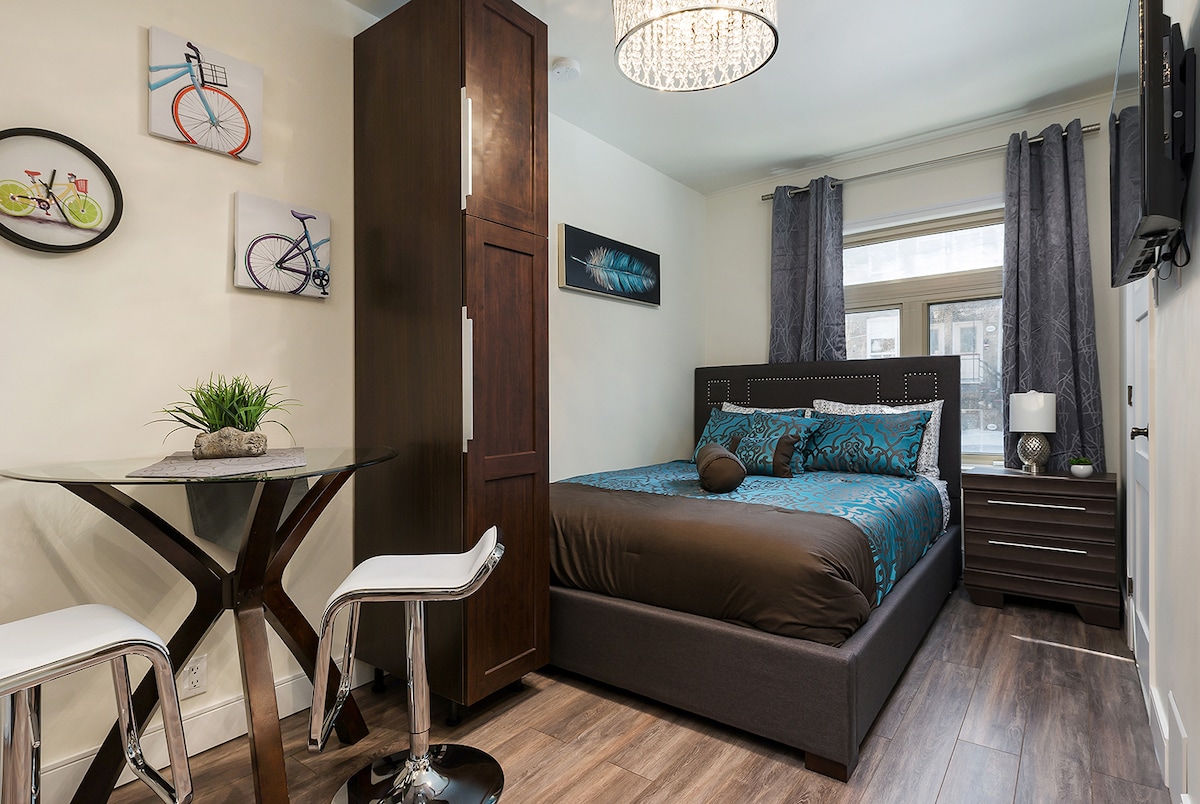 Picture a compact, immaculately kept studio nestled in the heart of downtown Montreal. Its simplicity is its charm: pristine white walls create a canvas for the room's personality to shine. Clever storage solutions tuck away belongings, ensuring every inch is utilized efficiently. Unique touches add character and warmth to the space. With its cleanliness, thoughtful design, and individual flair, this studio offers a haven of tranquility amid the urban hustle and bustle.