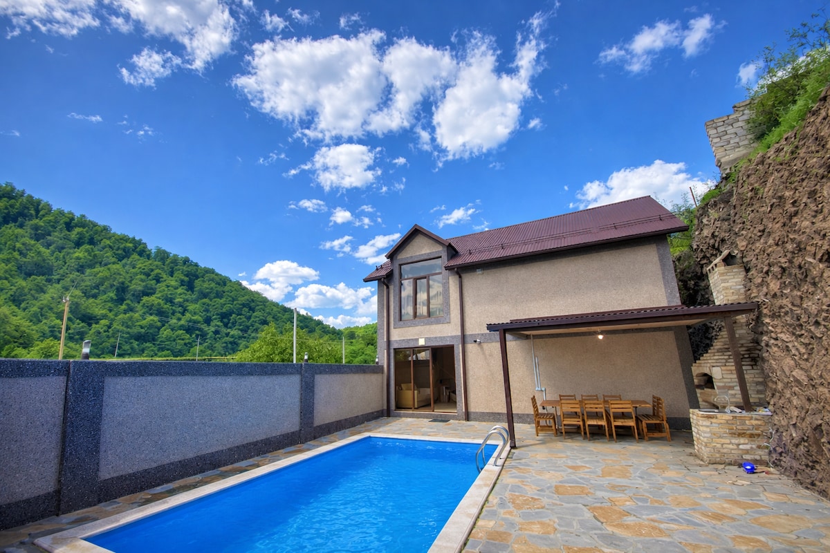 Your home in the mountains 🏡2 cozy bedrooms + living room-sleeps up to 8. Fully equipped kitchen: fridge, stove, oven, kettle, dishes & essentials, coffee & sugar.1 modern bathroom with continuous hot & cold water, washing machine, shampoo, shower gel, soap, hairdryer, towels, disposable slippers, free Wi-Fi, heating, Smart-TV, music-box, bedding, iron, first aid kit & other household & hygiene supplies. House is rented entirely, including a private yard .