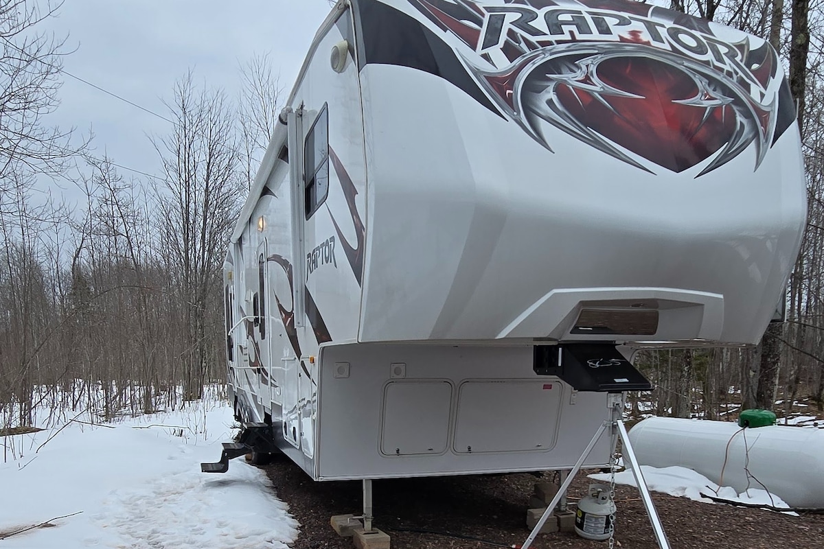 Off-grid, secluded, peaceful camp site on private property. Just four miles from beach on Lake Superior! Our large fifth wheel trailer is an updated, comfortable space for two; one queen bed. Room for a travel crib inside, or children in tents, on your camp site. No 110-V plug-in electricity or running water. However, propane fridge, stove and heater, battery-powered lights. Fresh drinking water and a luxury hand-crafted outhouse. Shower facilities. Relax around the campfire! Go exploring!