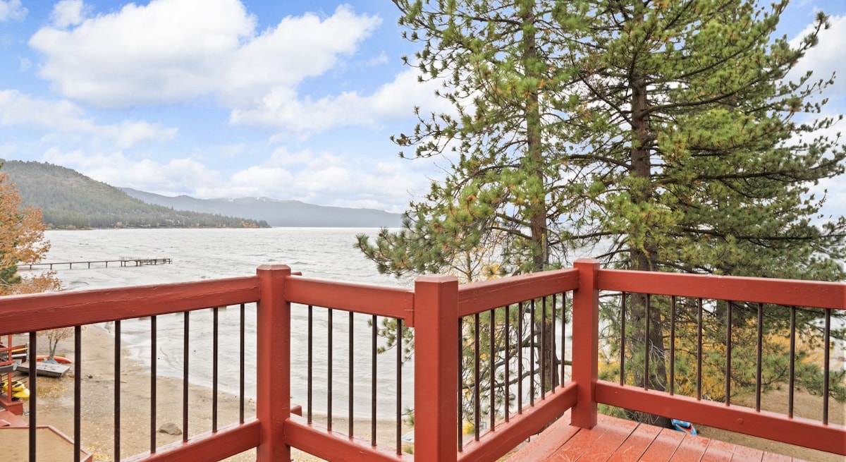 LAKEFRONT CABIN right on the Lake! Step onto the sandy beach right from your deck. Enjoy panoramic lake views from within your cozy cabin with gas fireplace, back dropped by the stunning Sierra Nevada Mountains. Lots of natural light floods the space equipped with full kitchen and a separate bedroom with queen bed. There is a full bath and 2 twin day beds that serve during the day as the sofas. Paddle board or kayak right from the deck. The views and ease of enjoyment are endless.