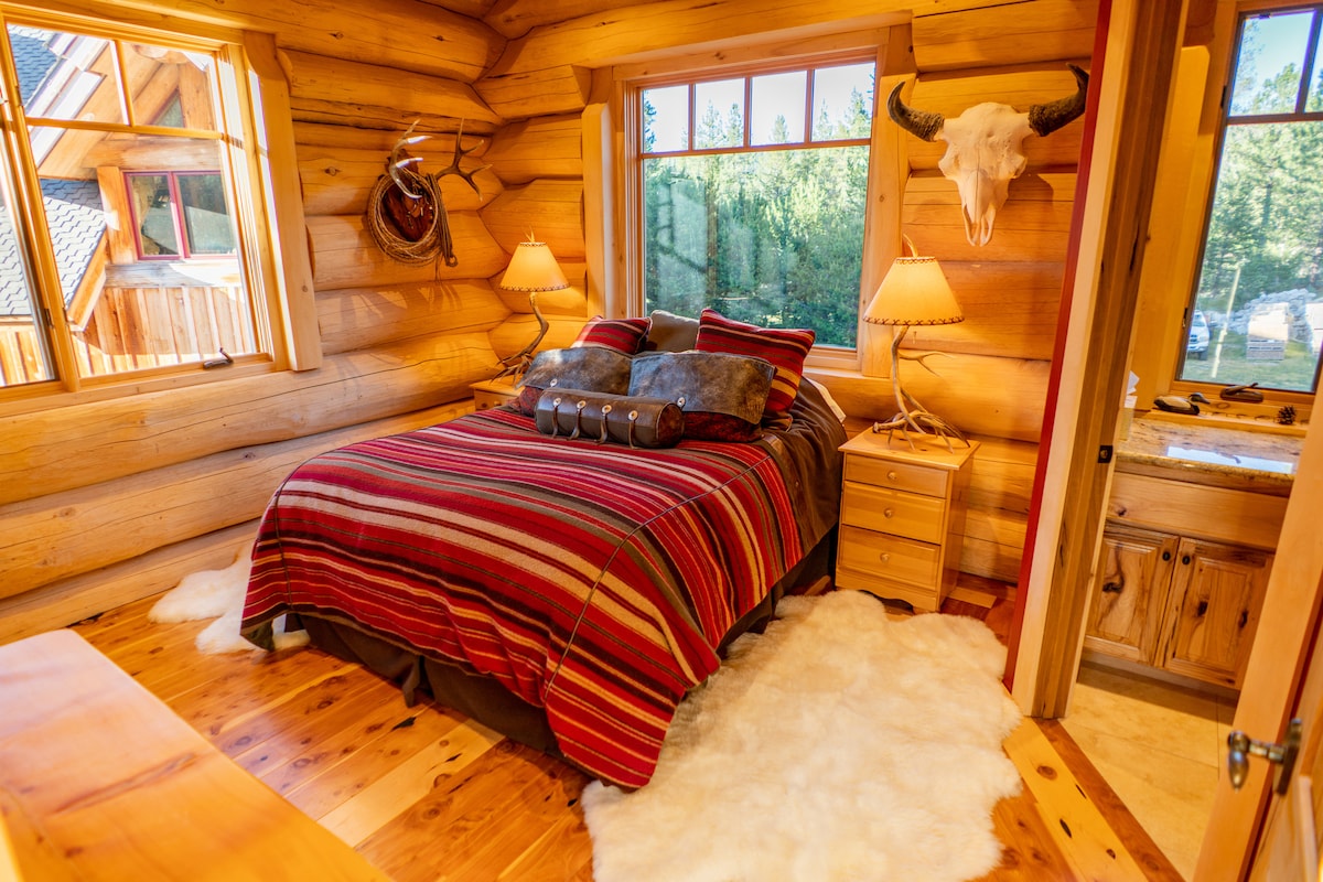 Welcome to the Dreamcatcher, cabin style hotel room. This Native-American themed room has breathtaking hardwood flooring throughout this luxury room featuring a queen size bed, a gas fireplace, a kitchenette with a handicap-accessible, walk-in shower with a full-body spray wand. No A/C ADA HANDICAPPED ACCESSIBLE | FIREPLACE | KITCHENETTE | QUEEN BED PET FRIENDLY