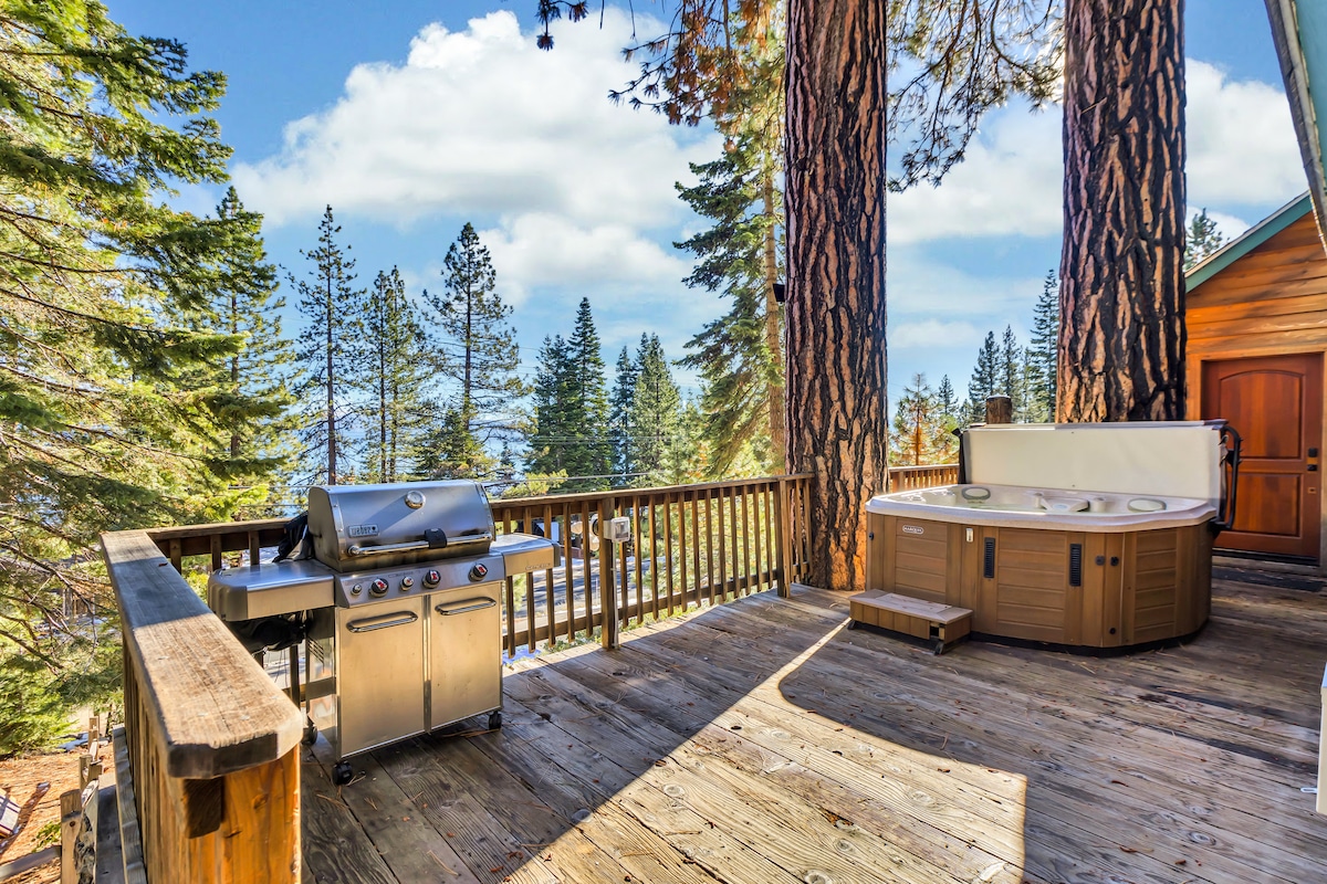 Escape to this stunning chalet-style cabin nestled among the towering pines. Just a 3-minute walk to Marla Bay's beach, this luxurious retreat blends rustic charm with modern comforts. Enjoy Lake Tahoe views from the spacious deck or relax in the private hot tub. Inside, vaulted ceilings, a gourmet kitchen, and cozy wood accents create a warm, inviting space. Perfect for families, with 4 bedrooms, multiple outdoor areas, and proximity to hiking trails, Marla Bay Beach, and outdoor activities.