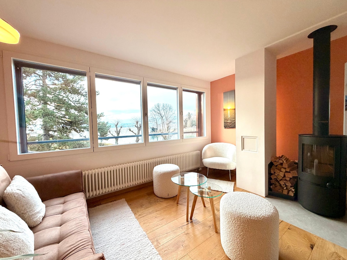 Award-winning jewel on the lake of Thun. Newly built, architecture award-winning house on the lake. Boat-like experience with views of the Bernese Overland mountains Niesen, Stockhorn, Eiger Munch and Jungfrau mountains. Perfect for a romantic getaway or a small family holiday. The living room, balcony, kitchen and bathroom are located on the lower level. 2 bedrooms are located at the mezzanine level. The outside terrace is directly on the water oriented to the south. 15min drive to Thun.