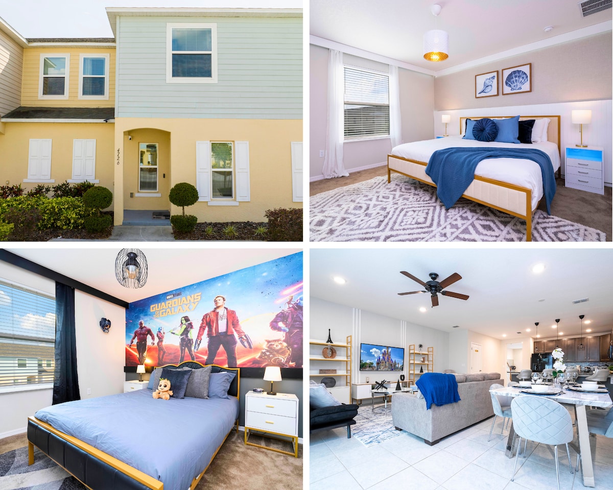 This townhouse provides an open main living space that allows you to connect the dining and a fully equipped kitchen. The house can accommodate up to 6 guests, divided into one luxe king en-suite, and a design theme two full en-suite. After a long day at the parks with a beautiful lakefront view, relax in your private spa. Clubhouse with a gym, amazing heated pool, pool bar, a restaurant, and only 5 min from Disney and golfing area Free Parking Close to lakes, camping, beach, vineyards, farms