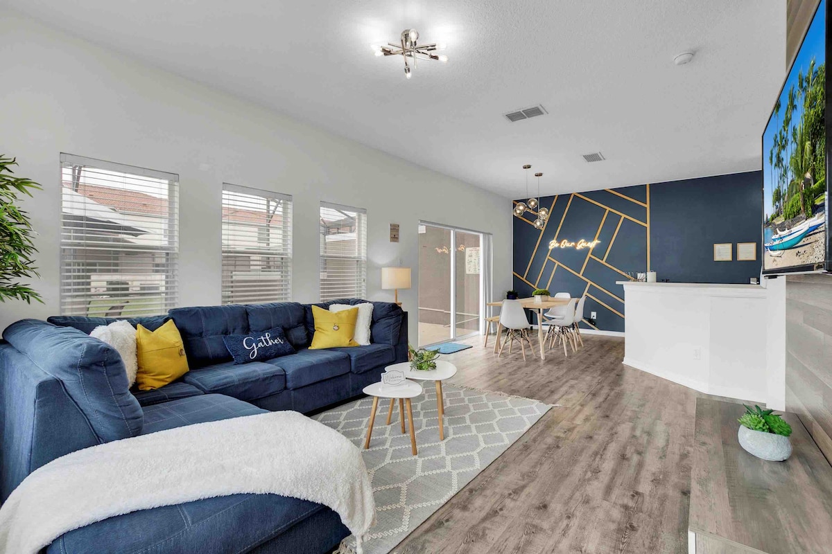 Sit back and relax in this stylish home with all the amenities you need for a fun family getaway. This home has a spacious layout with 3 bedrooms and 2 baths. We have thought of everything so you don't have to-toiletries,washer/dryer, and wifi. Enjoy your morning coffee in the screened in pool area with a beautiful sunrise and lake view or sip a glass of wine while floating in the pool. Just minutes to Theme Parks and major highways, this is the dream home you have been waiting for!