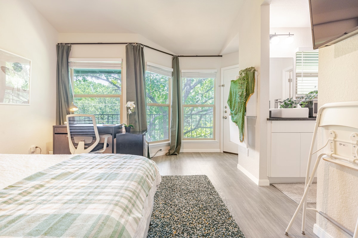 Experience your home away from home in this stylish and inviting studio, nestled in one of South Austin’s most cherished neighborhoods. Ideal for a weekend getaway or a longer visit, this carefully curated space combines comfort, convenience and privacy. ::Fully equipped kitchen with stove, oven, fridge + drip coffee ::High-speed WiFi and Smart TV for work or relaxation ::In-unit washer/dryer ::Free and easy on-street parking ::Complimentary snacks, coffee