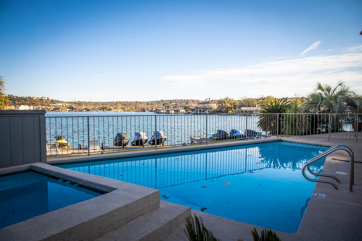 Waterfront top floor villa with deep water views from large patio, living room and bedroom. Daily deer encounters. Watch sunsets on Lake Travis' private island. Stand up shower, jacuzzi tub, washer/dryer, weekend salon/spa, restaurant, 3 pools, hot tubs, saunas, elevator access, fitness center, shuffleboard, WiFi, pickleball and tennis. Max 4 guests, including infants and children. 21+ to book. More villas available for family. Nice people only! 😊