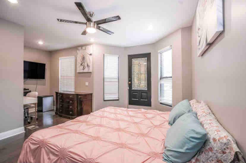 Bronzeville 42 (B42) is a vibrant space where art meets hospitality! Featuring art from the owner's private collection, B42 is beautifully decorated and conveniently located in the historic Bronzeville neighborhood just 5 miles from Downtown and minutes to Hyde Park, the lakefront beach, and the upcoming Obama Presidential Center (opening June 2026). Dining Table seats 6 Kitchen Table seats 4 Sleeps 8 -BR1: King bed -BR2: 2 Twin beds -BR3: 2 Queen beds 2 Full Bathrooms