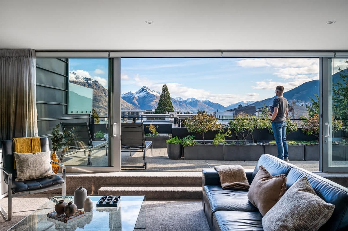 Luxury Top-Floor Villa | Hot Tub, Views, Parking This 3-bedroom, 3-bathroom Queenstown villa offers the ultimate stay, featuring a brand-new private hot tub with breathtaking lake and mountain views. Enjoy a stylish open-plan living area, gas fireplace, and balcony perfect for sunrise coffee or sunset wine. Fully climate-controlled year-round with secure garage parking, just a short stroll from Queenstown’s restaurants, shops, and adventure activities.