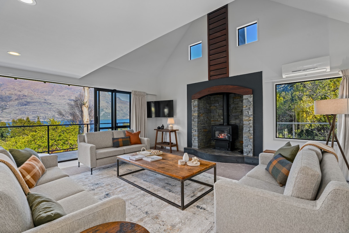 Kikorangi Lake Villa – Lakeside Luxury with Panoramic Views Wake to breathtaking 180° views of Lake Wakatipu and The Remarkables from your private balcony. Set right on the lake’s edge and just a 5-minute drive or scenic 30-minute walk along the Queenstown Trail to town, this modern villa is a tranquil summer base for couples or friends to enjoy wine tours, lake adventures, biking trails, golf and vibrant dining.