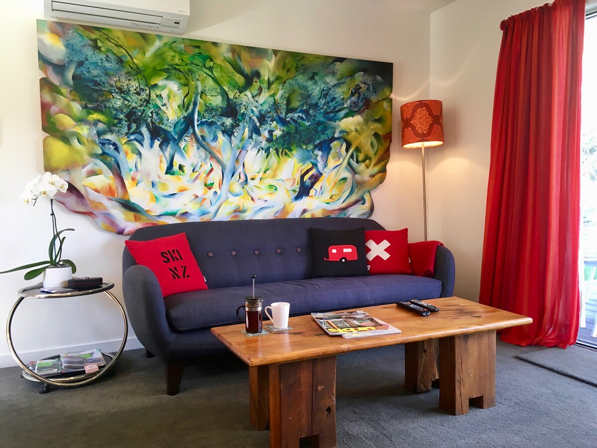 New in 2017, a purpose built, 2 bedroom, 2 bathroom, modern, retro styled, apartment. Quiet, well established neighbourhood, 3 minutes drive to town centre. Everything you might need for a Wanaka holiday. Heat pumps in all rooms. Top quality Queen beds, large methven shower, outdoor deck onto sunny garden with mountain views, bbq. Perfect for 2 couples or a family, everyone is welcome here. Friendly, helpful Kiwi hosts! Please take a 2 min video tour. Search YouTube "Retro apartment Wanaka"