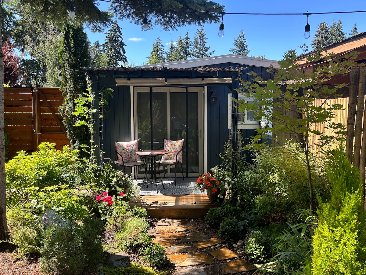 Full garden views, bright and modern secluded "guest house" 5 minutes off the highway and 10 minutes from the ferry in western Bremerton. The space is a standalone unit detached from our main house tucked off the main street, nestled amongst the cedars and firs along Mud Bay connecting to Puget Sound. The room has a full 270 degree view on the gardens and trees, queen size murphy bed, fridge, sink, microwave, wood stove and bathroom, complete with 16" outdoor rain shower.