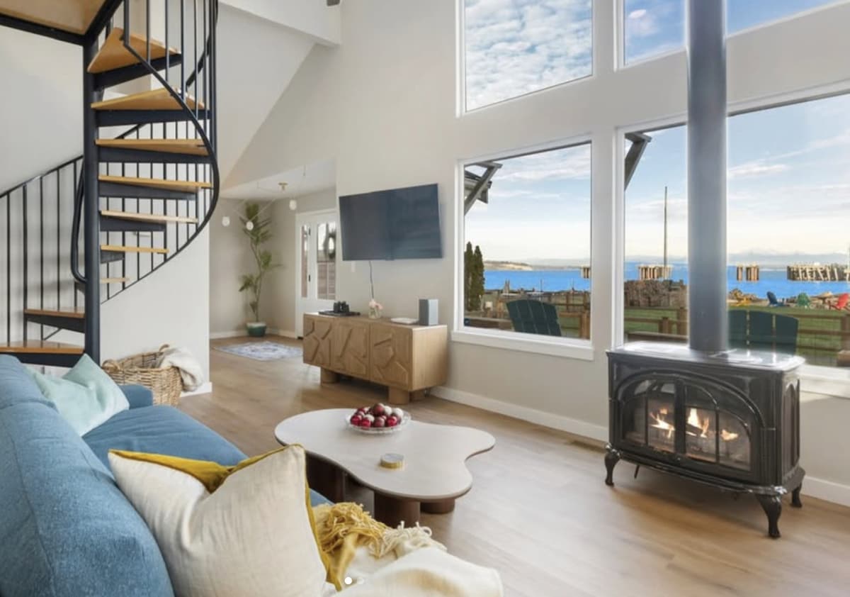 Modern farmhouse cottage on Lake Sammamish—2 bed / 2 bath with A/C and gas fireplace. Both bedrooms feature plush down comforters and pillows. Enjoy hardwood floors, a well-equipped kitchen with new appliances, washer/dryer, dining for 6, a sleeper sofa, 55” TV, and coffee bar. Relax with lakeview dining, kayak the shoreline, or explore the Lake Sammamish Trail just outside your door. Well-behaved dogs welcome!