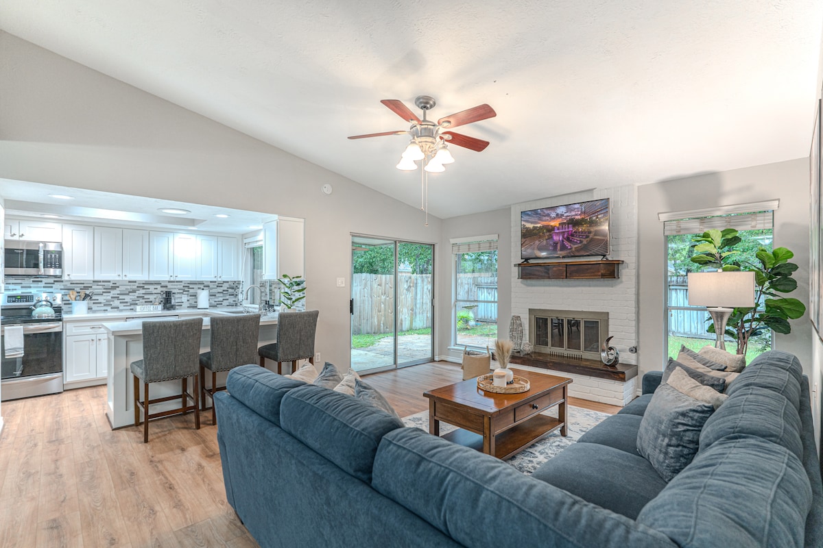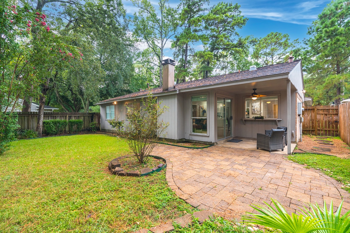🍃Casa Granada is the perfect getaway home for families and groups- modern and cozy! Our floor to ceiling sliding glass doors, reveal our large, private backyard. Making this home, truly one of a kind. Only minutes away from The Woodlands and shops on Market street. Enjoy a night in with our Philips hue lights to set the perfect mood. You can also work remotely or hit the home gym! WIFI/TV/PARKING/CENTRAL AC/WASHER/DRYER/PATIO/GYM **For a grill: must be requested 24 hours before check in