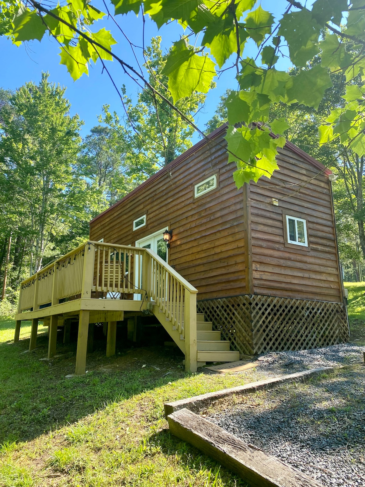 This delightful tiny house in the woods can accommodate up to 5 people. It has a full kitchen, loft bedroom, bathroom w/ full tub and shower, and living area. You can sleep in comfort, enjoy making breakfast with farm fresh eggs, enjoy the morning air from the deck, sip coffee by the pond, or hike through the wooded trails. Relaxation and simplicity await you here. We welcome up to 2 dogs, no other species; pet fee will apply. Guests 14 and under MUST wear a life jacket at the pond. No smoking.