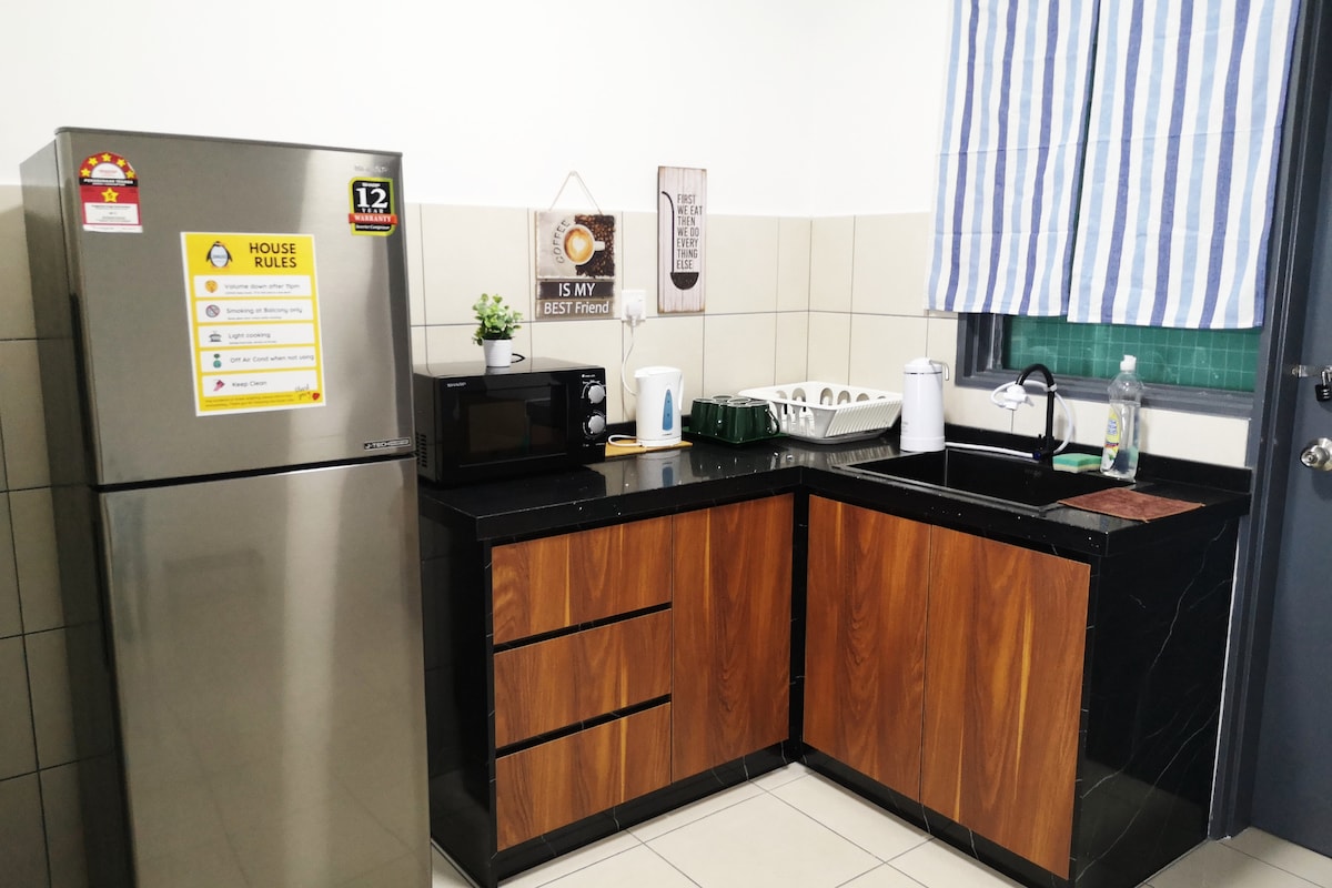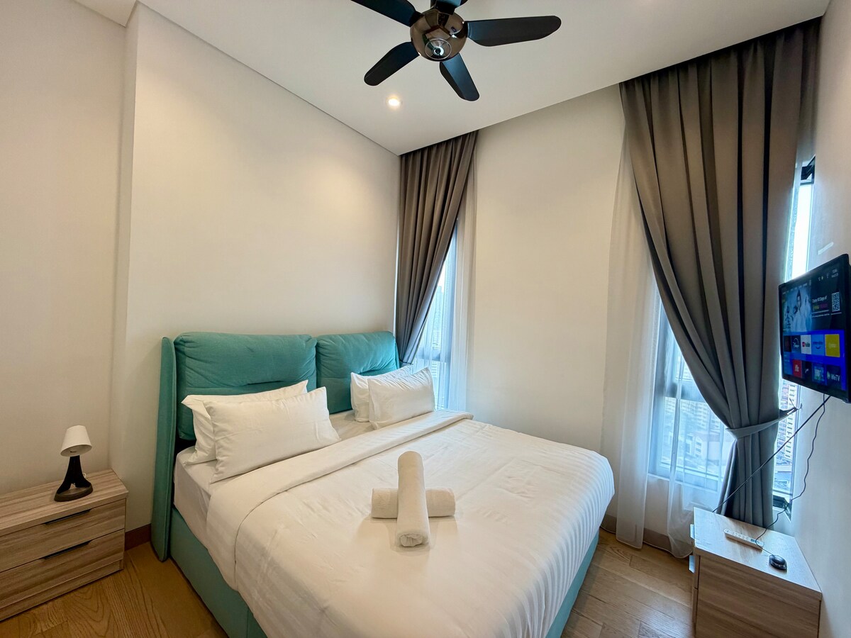 Super king-sized apartment featuring a living room, kitchen, and a private bathroom with a bathtub. The apartment is within 5 minute walk from KLCC, the iconic Petronas Twin Towers. Super king size bed with 200cm width and 200cm length for stay up to 2 adults. Not suitable for children or infants. Internet of 300 Mbps fibre optic cable. Premium Netflix in both living room and bedroom. Washer and dryer also included for the guests. Paid parking not free at basement. Light cooking is allowed.