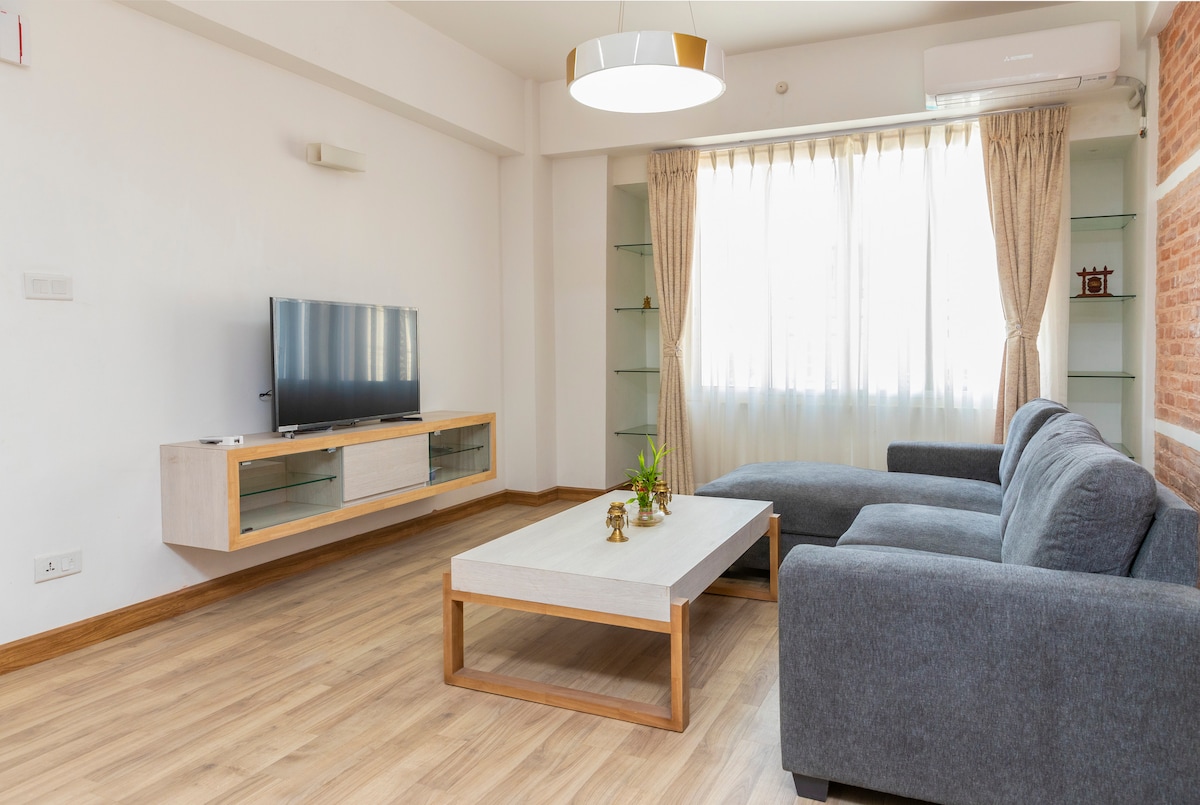 A thoughtfully designed 3-bedroom apartment in central Jawalakhel, offering generous space, natural light, and a calm residential atmosphere. The bright living area opens to a private balcony, while clean and spacious space create a refined yet comfortable feel. The master bedroom features an attached bathroom, walk-in closet, work desk and balcony, two additional bedrooms offer queen and twin beds. A fully equipped kitchen with balcony and a common bathroom support both short and long stays.