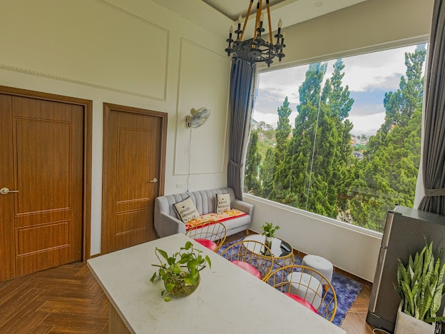 This is our highest and most open-view room, offering the best panoramic scenery. It features two balconies — one facing a blooming flower garden, the other overlooking the iconic greenhouses of the famous Thai Phien flower village. A perfect place to relax and take in the true charm of Dalat.