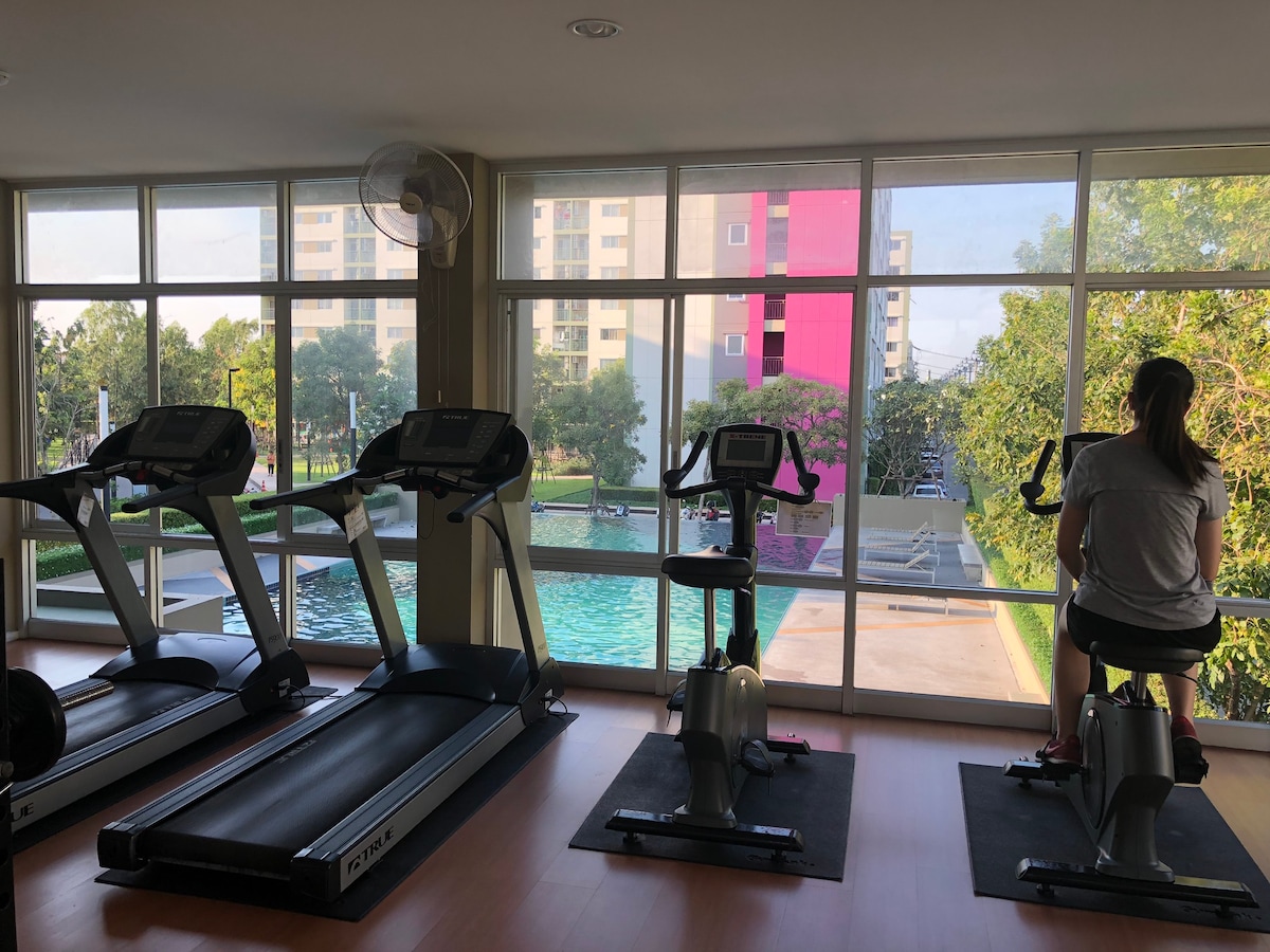 This unique place has a style all its own. Near Rangsit university, Bangkok University, Thammasat University, Future Park Mall Electricity, Water, WiFi. Included in bill already One of the best communities in the area for young adults Basketball, volleyball, futbol courts, pool, parks, and stores like 7-11 on-site. Full mini-mall at entrance to condo park. Including Lotus