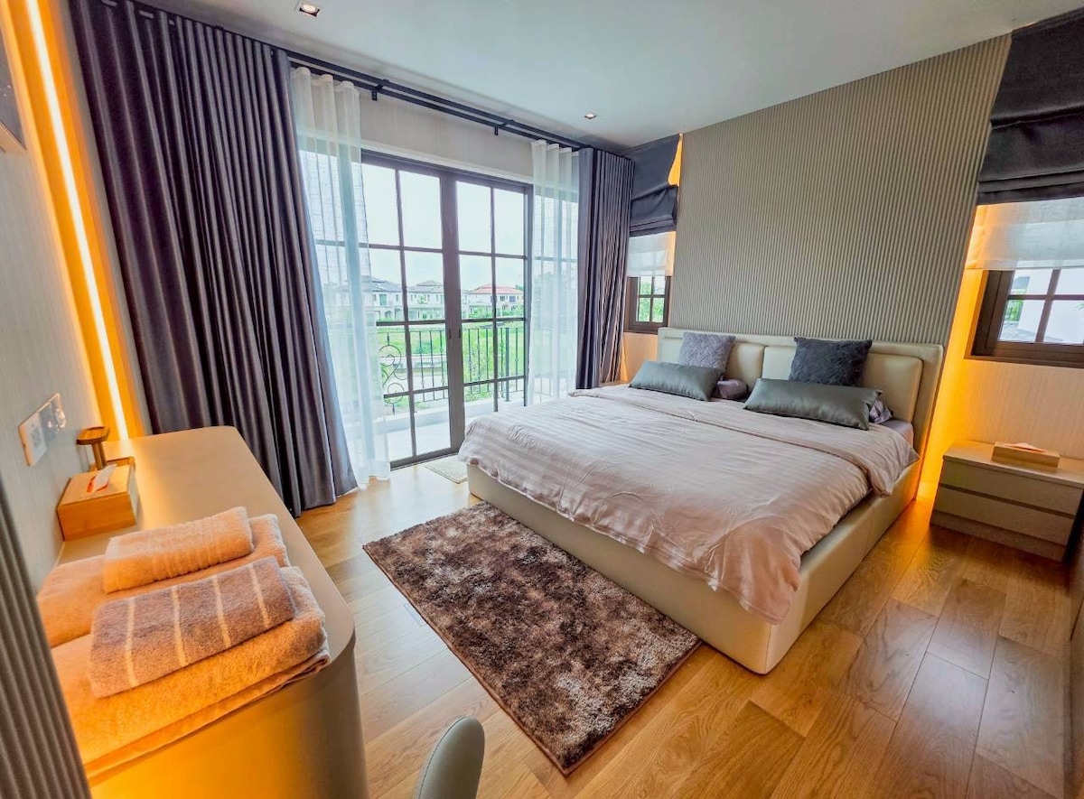 Newly House with Private Roof Top Near DMK Airport&KhuKhot BTS with Golf Court View in Bangkok Finished renovated June 2024. Maximum 11 people can stay. The entire house is for your group only. Experience the ultimate in luxury and comfort, private rooftop bar with views of the golf court and BTS Skytrain and landing airplane. one minute walk to 7-11 a few minute walk to local market, coffee shop, many street foods and restaurants 1 Km to Khukhot BTS Station