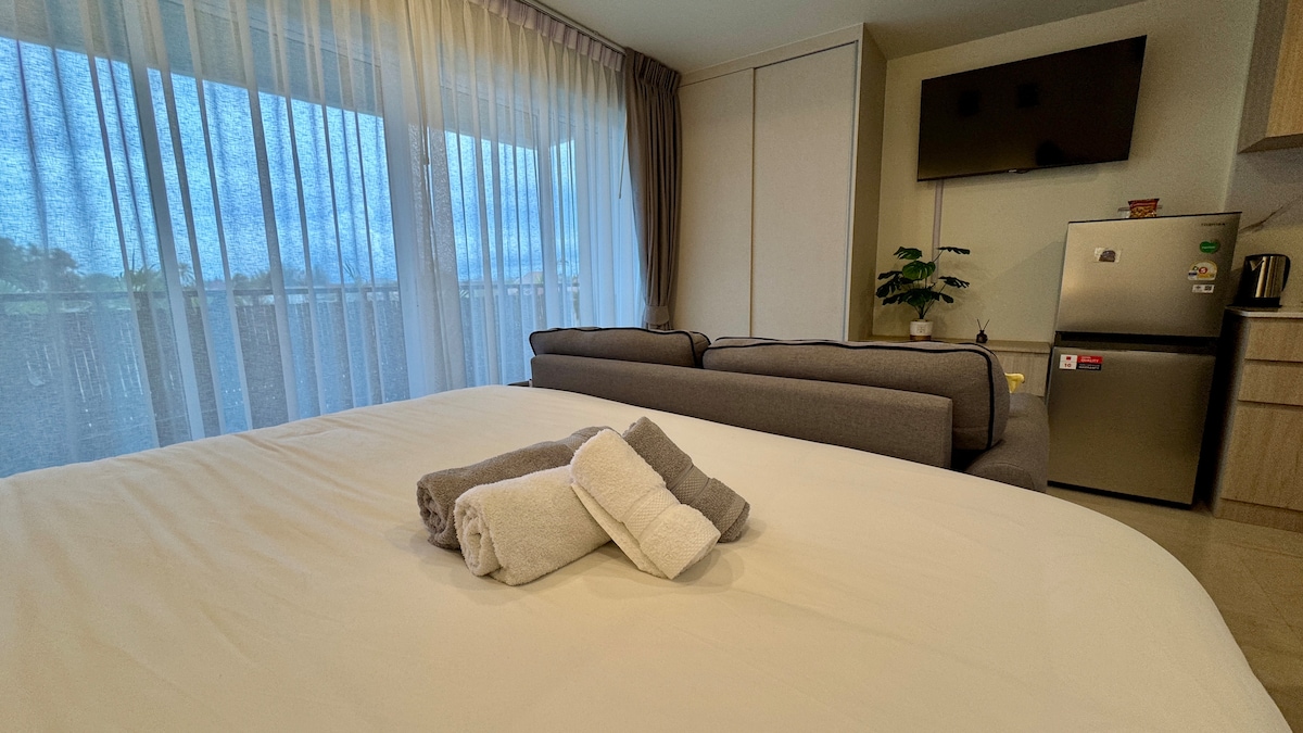Светлая и стильная студия с потрясающим видом на горы на 4-м этаже, полностью меблированная и готовая к проживанию. Всего в 300 метрах от пляжа и в 80 метрах от Пешеходной улицы Ламаи. К услугам гостей кондиционер, панорамные окна, функциональная кухня с микроволновой печью, плитой, чайником, холодильником и вытяжкой, бассейн, тренажерный зал с бильярдным столом и сауна Круглосуточная охрана Важная информация Электричество 6 бат за киловатт Вода 35 бат за юнит