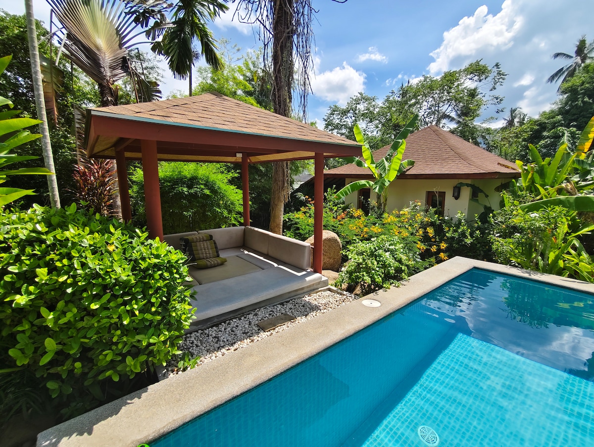 LOGEMENT CHARMANT ET COSY Découvrez notre petit coin de paradis situé à Lamai en bordure de forêt, à seulement 3 kms du centre-ville et 3 kms d'une des plus belles plages de l'île. C'est un bien unique: un bungalow pour 2 personnes avec son lit king size, sa salle de bain privative ouverte, sa terrasse privée, un jardin luxuriant et la piscine ! Vous n'avez plus qu'un objectif: profitez ! La piscine de 12m x 6m vous attend ! L'endroit idéal pour décompresser! Service ménage inclus tous les jours