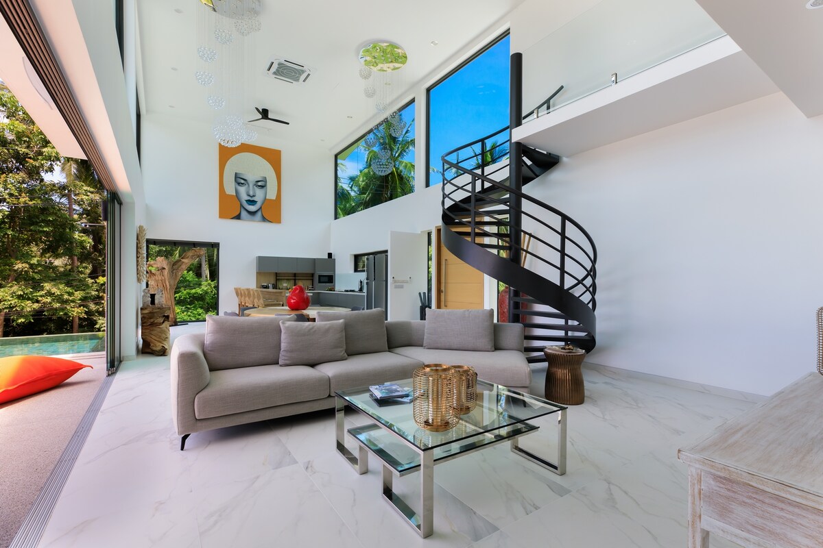 This superb villa is part of the Headland (Villa 2) an exclusive estate in Baan Taling Ngam on the southwest coast, just next to Intercontinental hotel. It boasts direct beach access, a private infinity pool, breathtaking views of the islands, striking turquoise colors and beautiful sunsets, 4 bedrooms all en-suite, a tropical lush garden and decade old trees, large outdoor living areas, bright white indoors, beautiful decoration, indoor-outdoor living, exceptional service and complete privacy