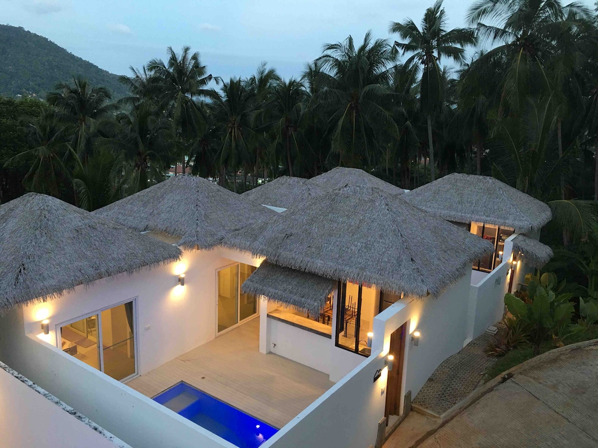 Prices include all utilities except electric (6b/unit). This modern 2 bed 3 bath villa with own pool is blessed with breath-taking sea views of the jungle and sea beyond yet only 5-10 mins drive to town (Chaweng, the main town). Most people say the view is more "wow" than photos show. Sits amongst 7 houses, up a 2km winding private jungle road hill, 5 mins drive (15 min walk) to Chaweng Beach, the most popular beach. Transport recommended.