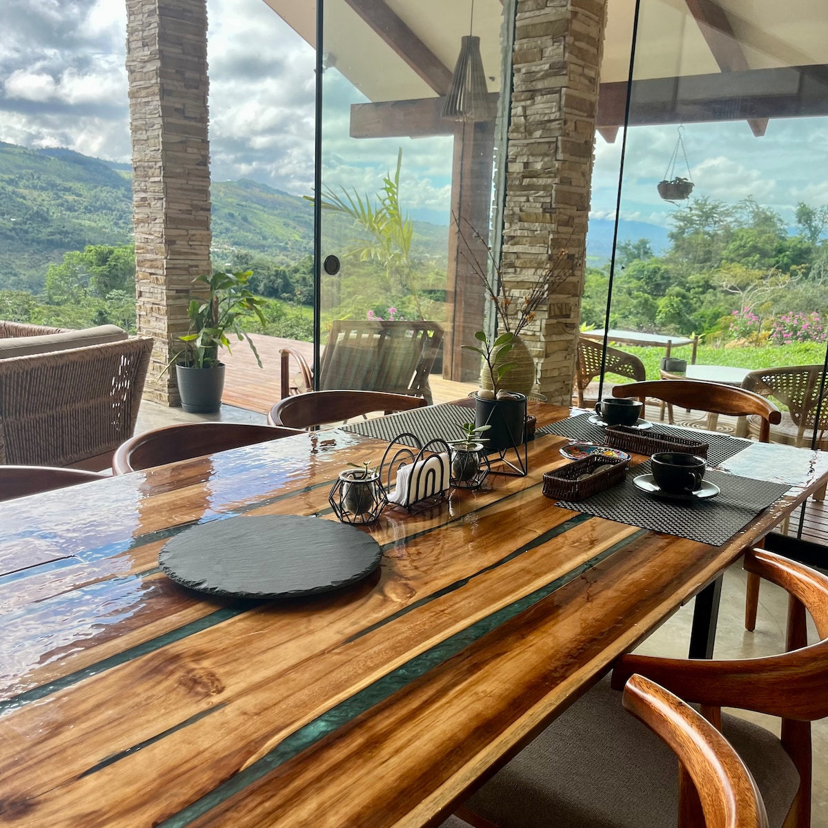 ¡Descubre la magia de la selva en nuestro Glamping! Diseñado para los amantes de la naturaleza, aventura y bienestar, con vistas panorámicas de la montaña. Relájate en una cama queen y disfruta de la terraza, hamaca aerea, el baño completo con ducha caliente, luz solar, cargador para celulares. Tiene wifi rapido de 6 am a 11 pm. La piscina y la cocina son de uso comun y en el comedor hay conexion de 220 volteos.