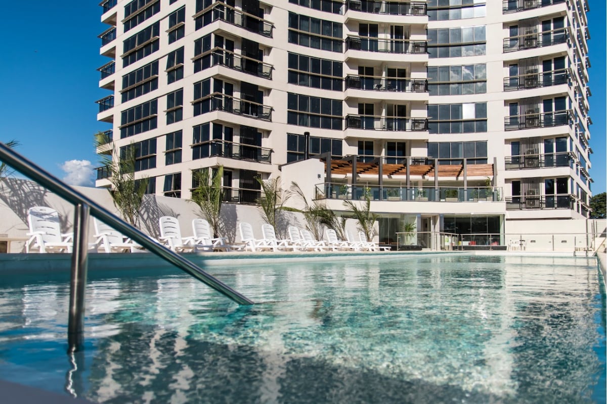 Departamento súper equipado en zona residencial, con balcón y parrilla, hermosa vista y amenities premium: - Piscina con solarium - Piscina climatizada - Sauna - Gym en altura - Rooftop + Quincho - Laundry - Seguridad 24hs - Cochera Excelente ubicación: - A 7 minutos del Eje Corporativo, Shopping del Sol y Paseo La Galería - A 10 minutos de la Costanera y el Puente Héroes del Chaco - A 15 minutos del Aeropuerto Silvio Pettirossi Cuenta con Wi-Fi, Smart TVs y colchones firmes de alta densidad