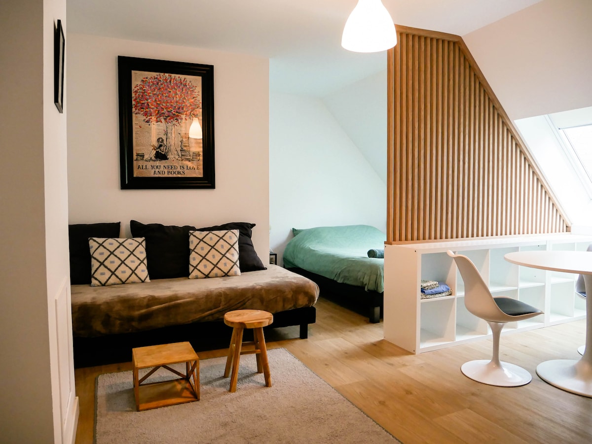 Profitez d'un logement élégant. Placé dans le vieux douai, au premier étage d’un immeuble. Entre 5 et 10 minutes de marche de toute commodité, gare, commerce, bar, etc Proche de beaux bâtiments et de belles architectures ! Studios de 20 m2 rénové au goût de jour : Comprenant une cuisine complète, une belle salle de bain, un coin salon qui se transforme en coin sommeil avec son canapé lit très confortable ! Profitez d’une télévision plat 4K et d’une connections wifi haut débit !