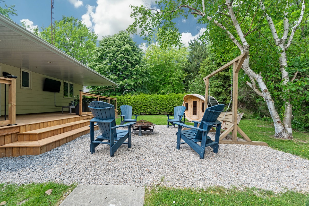 Have fun with the whole family at this stylish cottage located in Grand Bend, ON. Located in an exclusive area with gated access to Beach O’Pines community and private beach access. Lots of memories to be made at this modern up to date space. Enjoy the large backyard patio with outdoor dining amenities and lounge chairs. Relax and take advantage of the new outdoor sauna. Front area features a fire pit with comfortable Adirondack chairs to enjoy your time on vacation with family and friends.