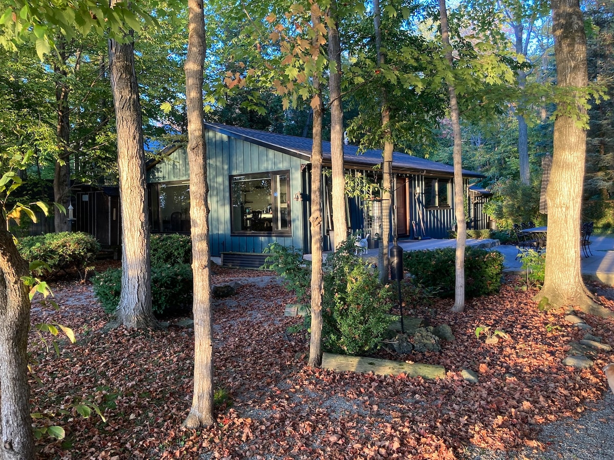 Peaceful - quiet setting Mid Century Modern Grand Bend Retreat, *NON SMOKING* Mid Modern Scandinavian Design Vacation Home in Southcott Pines, Outdoor screened room, 2 decks, easy access to beach and strip, WIFI, 65" TV, 55" TV, Natural Gas BBQ, 6 burner gas stove, onsite laundry, Central Air, fun loft bedroom, large lower sectional, rotating and recliner chair, shallow sand beach. Bring your beach towels and sunscreen!