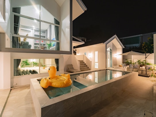 🔥清迈Sabai Sabai (B戶型)超大420平别墅靠古城3km豪华3卧3卫泳池度假别墅🔥KCKCKC866 泰国明星Sarapa曾经住过的房子以及很多清迈本地知名演员住过。 二、周边 泰国Sabai Sabai,别墅区位于古城南部商圈89广场和多个商圈重叠,每个房间均配有洗漱用品及消毒用品、纸巾。周边分布各种菜系的网红打卡星级餐厅。门口有各国料理,🇨🇳🇯🇵🇰🇷🇹🇭🇮🇹🇪🇸🇺🇸 距离清迈GOOD View 网红餐厅5分钟车程;距离清迈古城10分钟车程;距离清迈夜市8钟车程;距离清迈最大市场 7分钟车程;距尚泰百货购物商场,清迈机场10分钟,附近国际学校环绕。 三、三卧泳池别墅房型 能容纳8余人的聚会区,一层半超大客厅,超大露台一个厨房,私人泳池🏊,日光浴区🌞,烧烤区🍡,🍺可短租、日租、承接大型party🎉,聚会度假首选‼。 三张king size 大床 四、服务 1.有偿服务:饮料、私人厨师、接送机、租车、翻译、向导、芭比Q。 2.聚餐或轰趴,需另外支付1000泰铢清洗费用。
