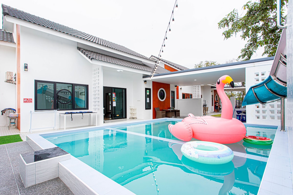 Charming Family Villa with Private Pool in Scenic Chiang Mai Escape to our serene 4-bedroom, 4-bathroom villa in the peaceful suburbs of Chiang Mai, perfect for families. Enjoy three ensuite bedrooms with stunning mountain views, plus a ground-floor bedroom with a kids' toy zone. The villa features a private 3x7 meter pool with a 1.5-meter depth and a slide, ideal for relaxation and fun. Our villa is only 30 minutes from the Old City and Nimman’s trendy cafes and boutiques.