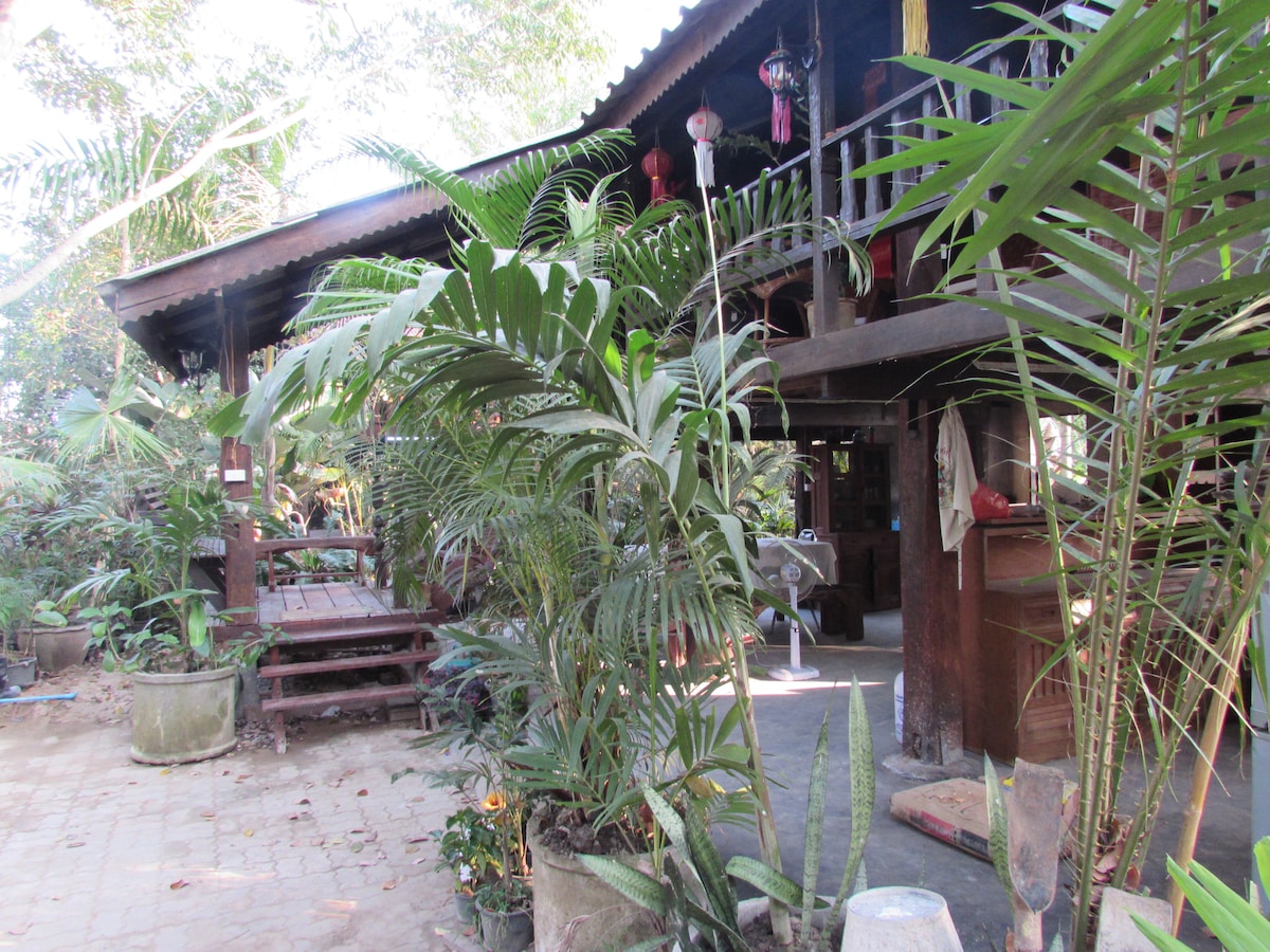 this is a old teak rice barn .all the wood in the house is recycled wood. two rooms i tried to give it a lanna thai style ,it is close to thai market western super market .lots of food and fruit and coffee shop 5 min. walk.full topical garden surrounds the house .public transport to the old city every 10 min. uber for late .scooters can be rented also.there is a few bugs downstairs. lots of birds sounds in the morning.there is 7 houses please check the other houses.