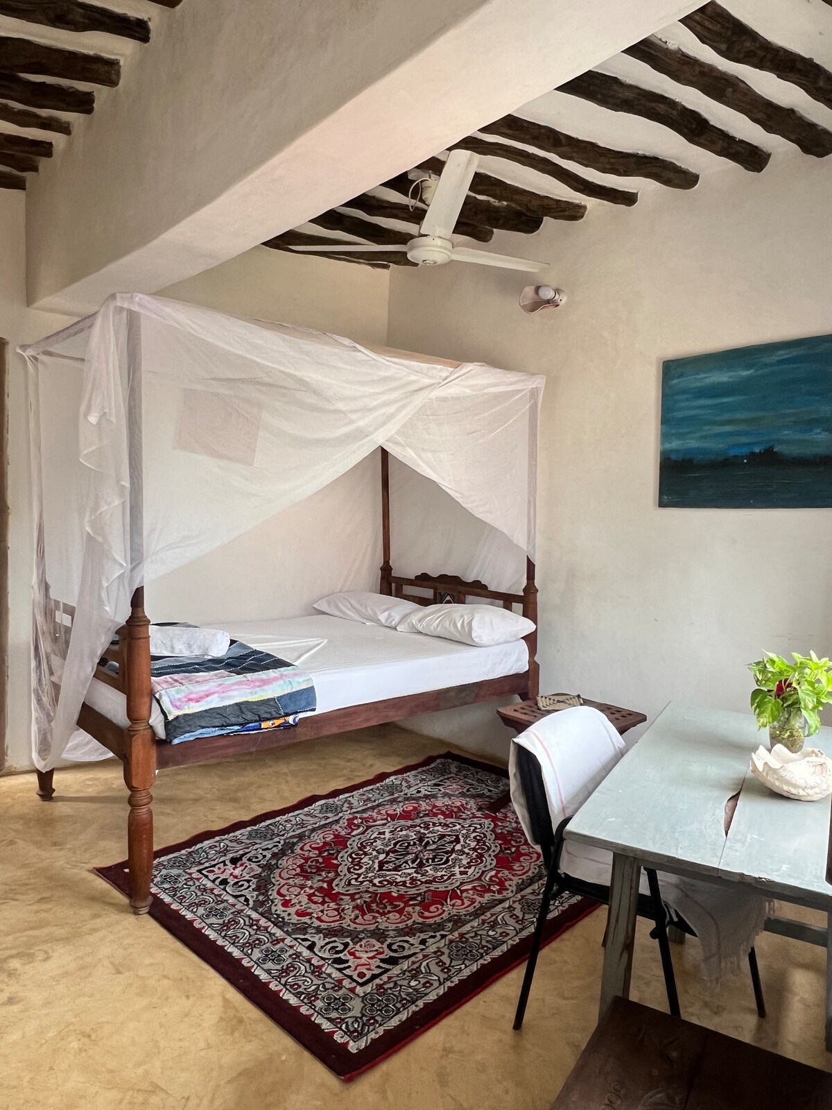 A light-filled gem. 2-story, 3-bedroom apartment with a gorgeous, rooftop verandah. Enjoy a relaxing and authentic experience at this centrally-located spot. Each bedroom has a king size bed w/ensuite bathroom, ceiling and standing fans. Fully equipped kitchen. Staff are available for shopping, cleaning and preparing meals. Tour the village and Lamu town. The beach is a 5-min. walk. Enjoy sunset, fishing, and snorkeling excursions, and amazing Swahili food at wonderful cafes and restaurants.
