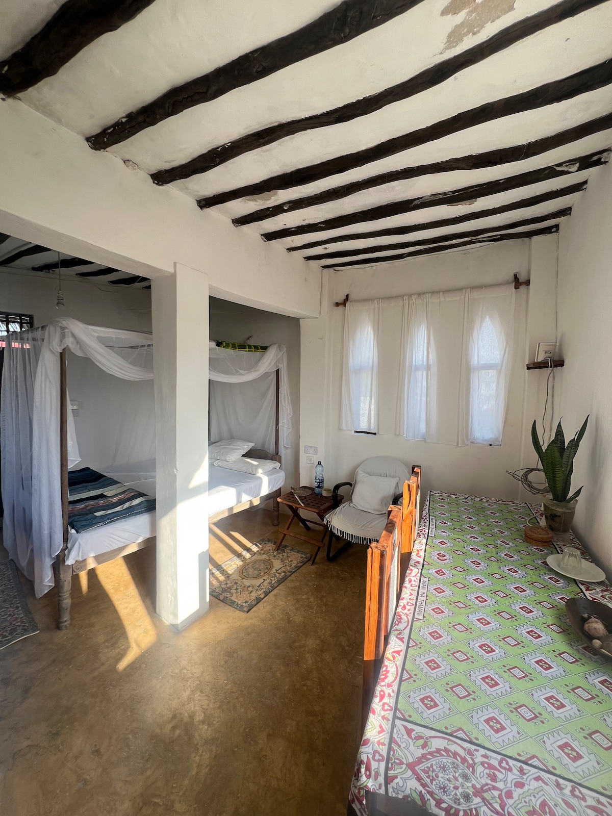 Khayrat Apartment, located in the heart of bustling Shela village is the perfect stay for your Lamu vacation. Our top floor apartment is made up of two floors, the bottom one consisting of two ensuite bedrooms, a fully equipped kitchen, a cosy living room and two balconies. As comfortable as this floor is, our rooftop is the place to be! You'll have a 360 view of the village, the ocean and the sand dunes behind Shela, including amazing sunsets and sunrises. Khayrat apartment sleeps 4 people.