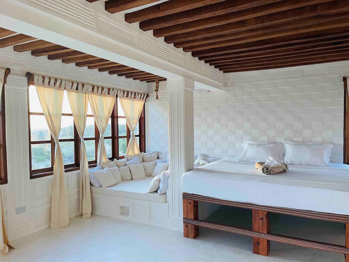 Wimbi House is the perfect home for a large family holiday or for a group of friends on an adventure. It is an ideal base from which to explore the Lamu archipelago and local culture. With 5 large en-suite rooms + extra staff room (for a nanny/guide). Multiple entertainment / dining areas and a beautiful pool and lush courtyard on the second floor. 99% Solar powered / Starlink internet / private chef. Wimbi is 3 min from the waterfront and 10-minutes from Peponi & the 12km pristine beach.