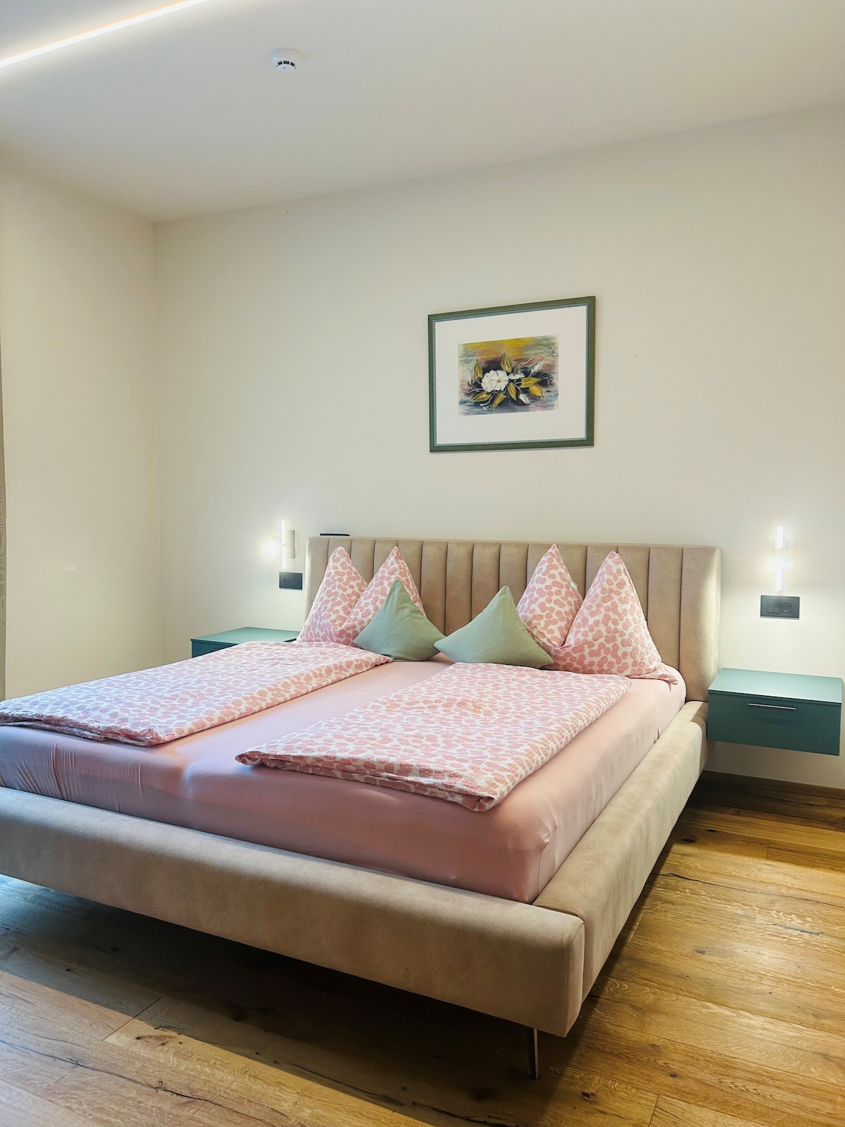 The 200 m² "Apt. Penthouse – Chalet Schenna" is located in a quiet area at the entrance to the village of Schenna and offers an ideal starting point for your stay. The holiday apartment on the 2nd floor is modern and high-quality, featuring a cozy living room with an open, well-equipped kitchen including a large kitchen island. With three bedrooms, three bathrooms, a sofa bed in the living room, and an additional guest WC, the accommodation can host up to eight people.