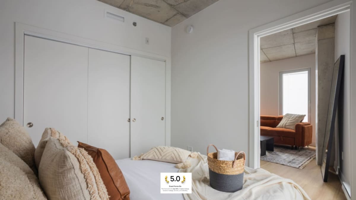 Enjoy your stay in the heart of the city ! Brand new TDC 2 downtown luxury with direct Bell Center access! Revel in comfort in our fully furnished and equipped one-bedroom condo with own private balcony! Your stay includes access to a sauna, pool, gym, skylounge, gaming room, lounge, and terrace with multiple barbecues. Free underground parking, with the subway just minutes away. Without stepping outside, the city is yours to explore. Plus, unwind with complimentary Netflix for the perfect stay