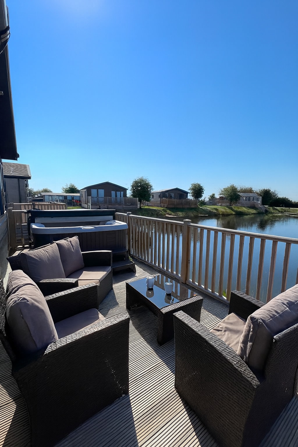 Keer Lodge enjoys an enviable location on the lake shore at the exclusive Pine Lake resort near Carnforth with uninterrupted views of the Lake and hills beyond from the lounge and patio. Open plan living and furnished in a modern Scandinavian style with plush leather sofas, a fully fitted kitchen, luxury Simba hybrid mattresses, a piping hot walk in shower and central heating throughout you will feel at home the minute you step through the door.
