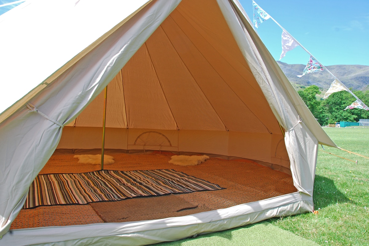 Large 5 meter Bell Tent located in the Lake District National Park near the historic village of Cartmel, with great views of both the coats and hills. 5 minutes from Lake Windermere, the site offers lots of green space to limited numbers of guests. The Bell Tent set up ready for your arrival, furnished with natural-style woven matting, sheepskins and rugs. Each tent has a table and benches provided. You will need to bring your own camping mats, bedding, stove and cooking equipment.