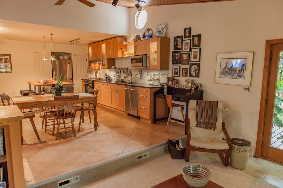 Cozy guest suite attached to main house in log cabin village. Full kitchen, dining area, wood stove, comfy queen bed, walk-in closet, games, 100 movies. Walk-in shower & built-in seat. Laundry room with door to deck area, bistro tables, firepit. The vaulted living room has pull-out love seat for one sleeper, TV [ROKU, You Tube TV, HULU, Netflix, Amazon, Disney], Blu-Ray player and Google Nest Mini. Enjoy breakfast items like fresh eggs, juice, milk, bread, coffee, tea and our homemade pizzelle.