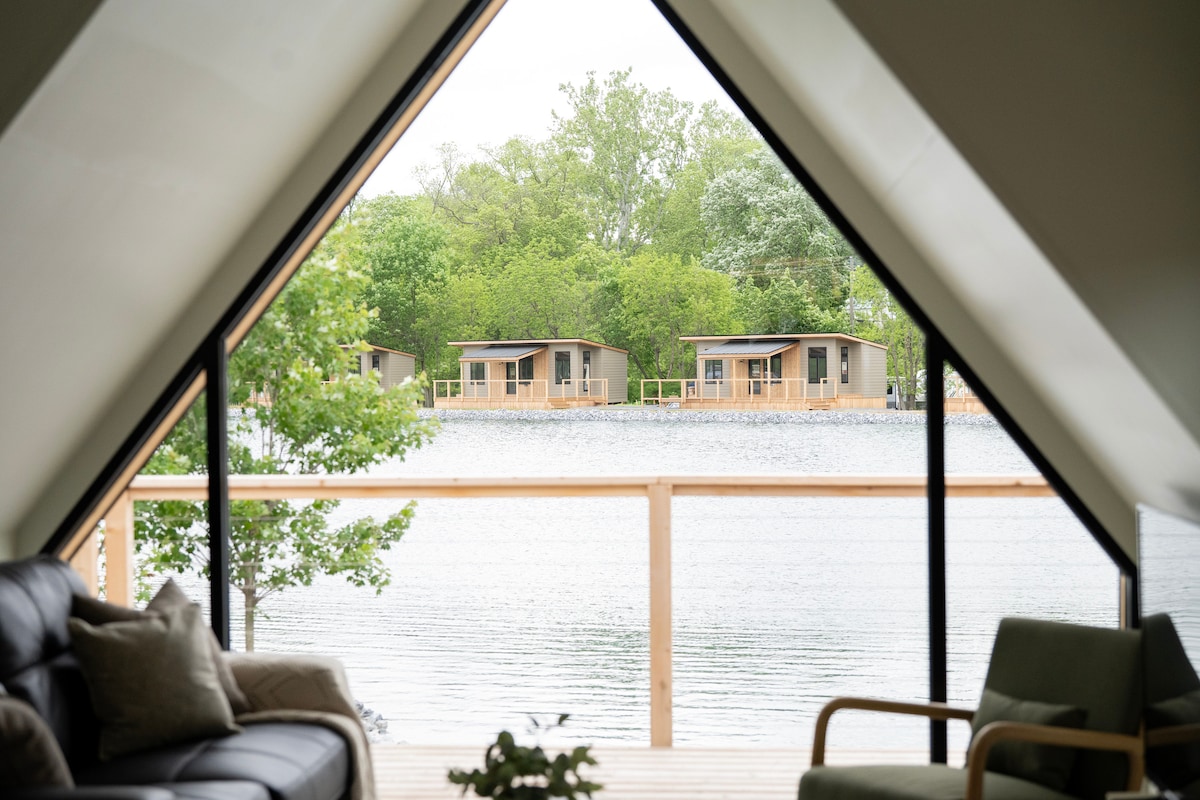 Relax in this cozy waterfront A-frame studio at Red Run Resort & Campground. Features include a king-size bed, spa-style bathroom with a soaking tub AND separate shower, and your own deck with stunning water views. Grill dinner over your own firepit with a built-in grate or cook indoors with a 2-burner cooktop in the kitchenette. Whether you're unwinding by the fire, soaking in the tub, or taking in the waterfront views, this peaceful retreat is perfect for a relaxing classic A-Frame escape.