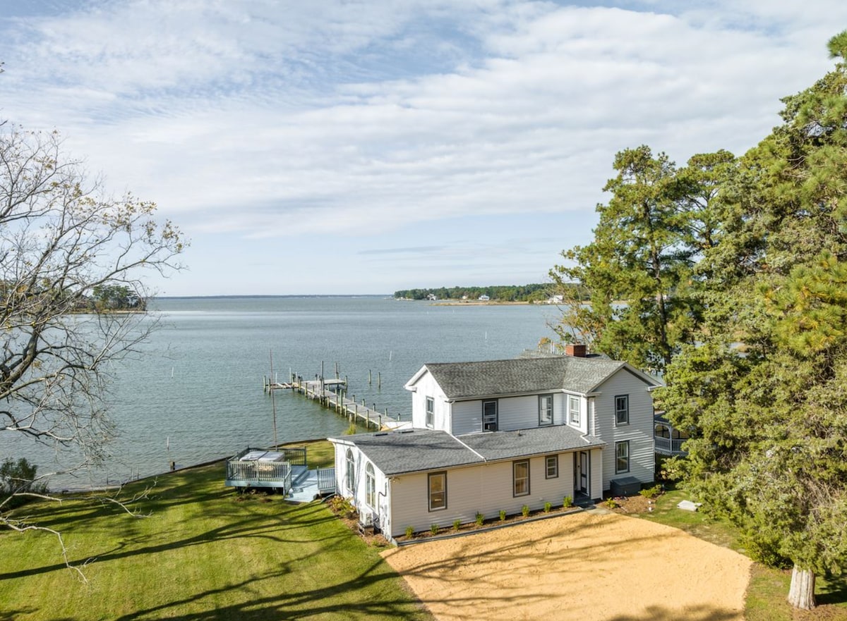 Take it easy at this unique and tranquil getaway. This fully renovated historic farmhouse sits on 4 acres on Windmill Point. Spend the day on the expansive yard or our private beach on the Rappahannock/Chesapeake Bay. Perfect for fishing, crabbing, kayaking or just relaxing! The waterfront pavilions and tiki bar are the perfect oasis to set up camp. The house was completely renovated historic home that offers unmatched comfort and charm. Enjoy water views from almost every room!