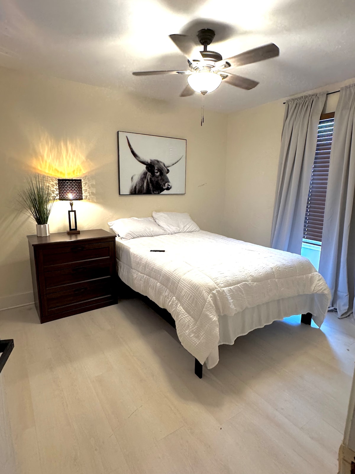 Enjoy the elegance of black & white modern style while staying in this Duplex home. Beautifully decorated with LED lights in the room, and a stunningly unique black-and-white tiled bathroom. The home has a full kitchen and we provide one space under the carport for your vehicle. We are about 5 minute drive from Fair Park and close proximity to Deep Ellum.