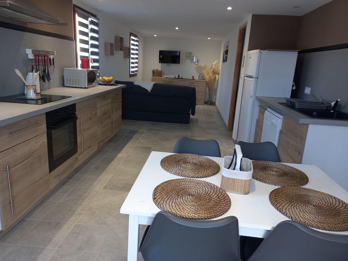 Gîte de plain pied comprenant : deux chambres équipées de lit de 160x200, une salle de bain avec douche, sèche-cheveux, une grande piéce principale avec cuisine équipée (micro-onde, plaques vitro-céramiques, four, réfrigérateur incluant un congélateur, lave-vaisselle...) un grand canapé avec télévision une terrasse avec salon de jardin, barbecue ... un parking privé pour deux voitures