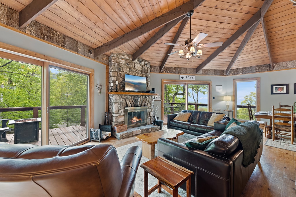 Gorgeously renovated! Stone gas fire place. New stainless steel appliances. New gas fireplace. Walk in shower. Long deck with comfortable outdoor furniture. Big Jacuzzi tub in master on suite. Open kitchen and living room looks out on large deck for privacy. Park 3 cars on flat parking area. 1 free bottle of wine * please note that this cabin is private with wooded views only, and across the street from Beech Mountain Club , convenient for concerts, brewery, mountain biking and skiing.